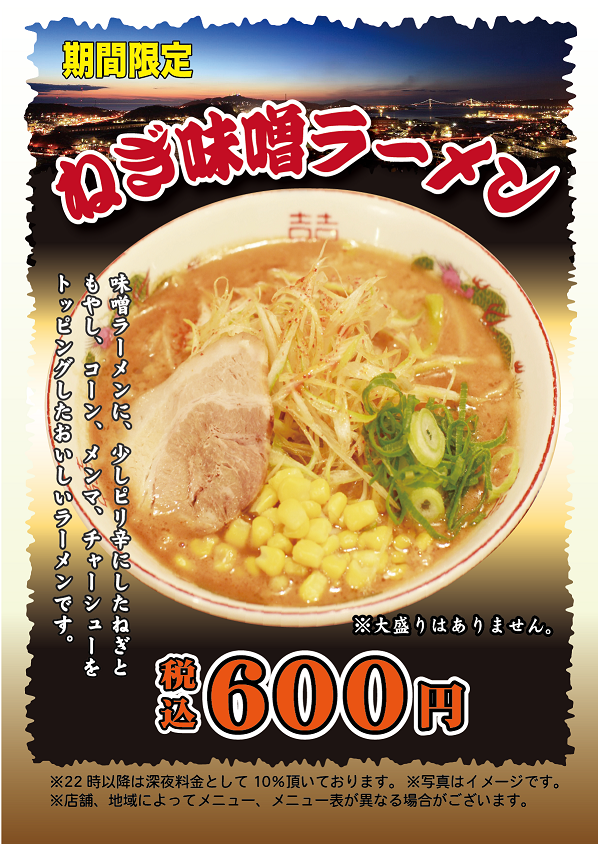 10月5日(月)より、期間限定メニュー「ねぎ味噌ラーメン」の販売がはじまります。